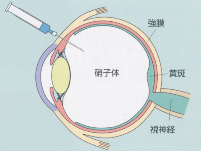 「加齢黄斑変性」「糖尿病黄斑浮腫」「網膜静脈閉塞症に伴う黄斑浮腫」「病的近視における脈絡膜新生血管」が硝子体内注射の対象となります。